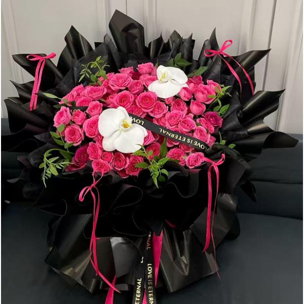 材质: 66枝弗洛伊德玫瑰,2枝蝴蝶兰,紫色+黑色丝带