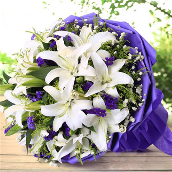 材质: 21朵香水百合,勿忘我、黄莺点缀