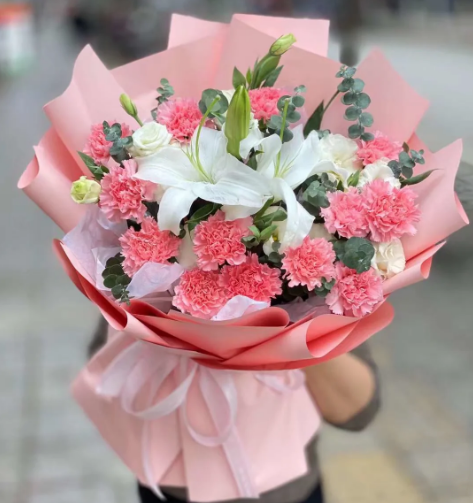 材质 15枝粉色康乃馨,4枝白玫瑰,2枝百合,洋桔梗,尤加利叶搭配