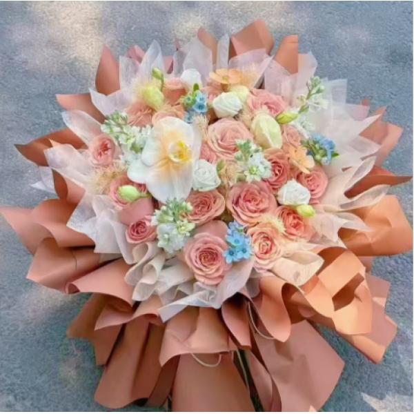 | 材质: | 19朵卡布奇诺玫瑰,1枝蝴蝶兰,4枝白色紫罗兰, 1枝永生花紫罗兰,蓝星花,桔梗,蓬莱松搭配 |