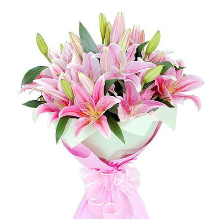 包装 内层浅绿色手揉纸,外层粉红色手揉纸,粉色网纱蝴蝶结系扎