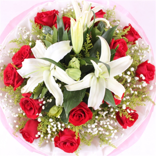 材质: 精心挑选19朵昆明红玫瑰,6朵白色香水百合。点缀黄莺、满天星,美丽迷人。