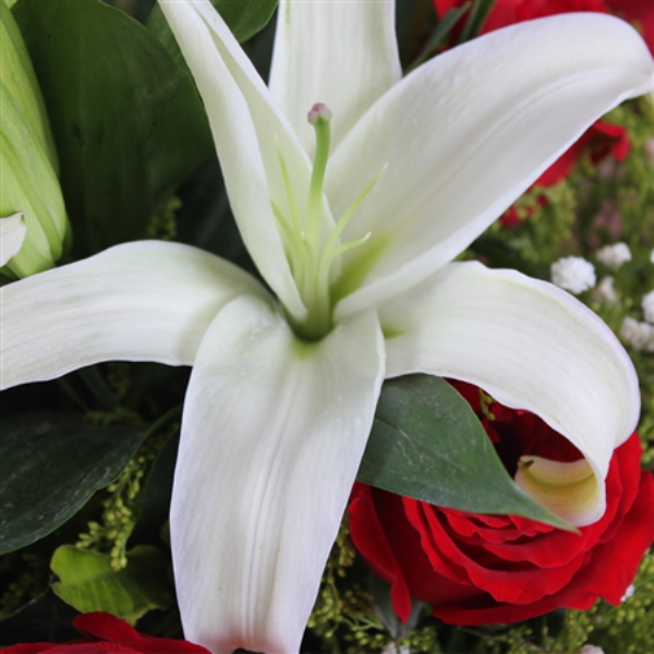 材质 精心挑选19朵昆明红玫瑰,6朵白色香水百合。点缀黄莺、满天星,美丽迷人。