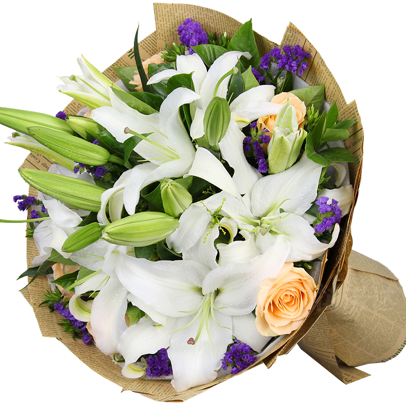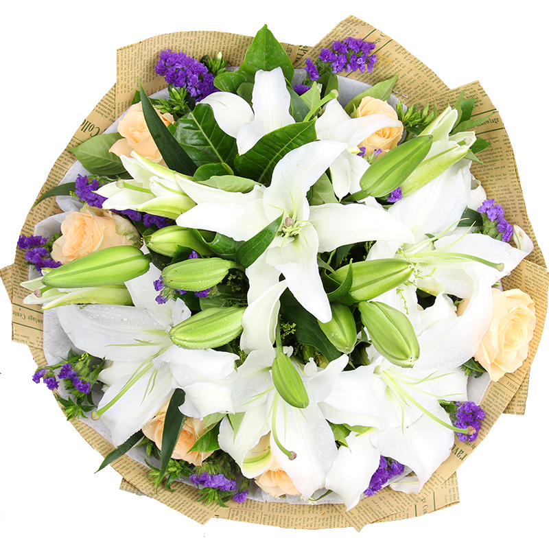 材质: 6朵香槟玫瑰,16朵百合,紫色勿忘我 栀子叶搭配