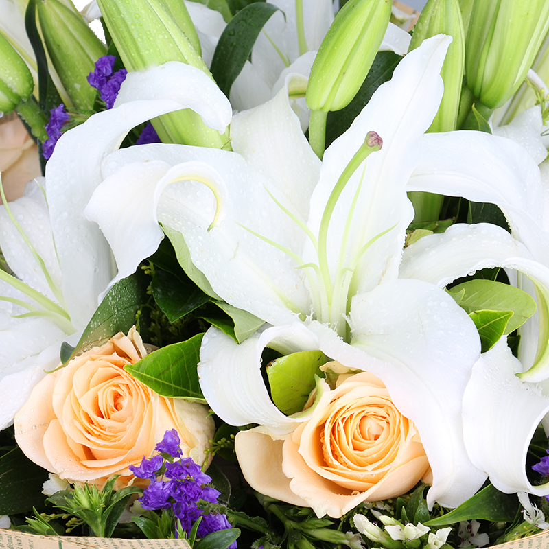 材质 6朵香槟玫瑰,16朵百合,紫色勿忘我 栀子叶搭配