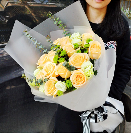 材质: 精选15枝香槟玫瑰 小绿菊 桔梗 尤加利叶搭配