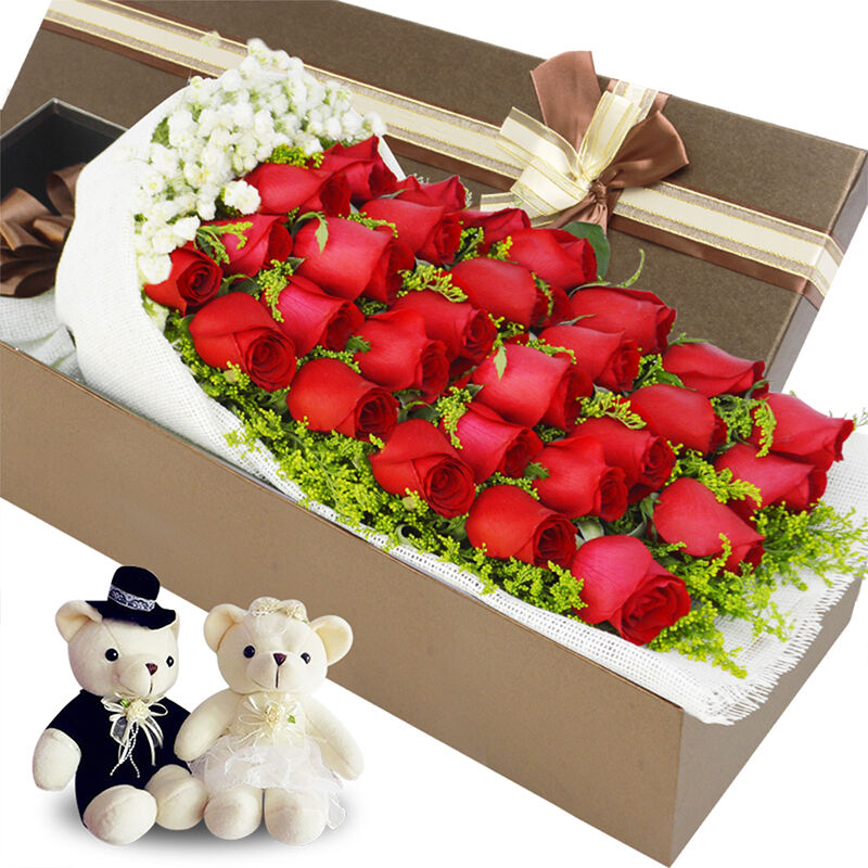 材质 29朵红玫瑰两只小熊 黄莺满天星