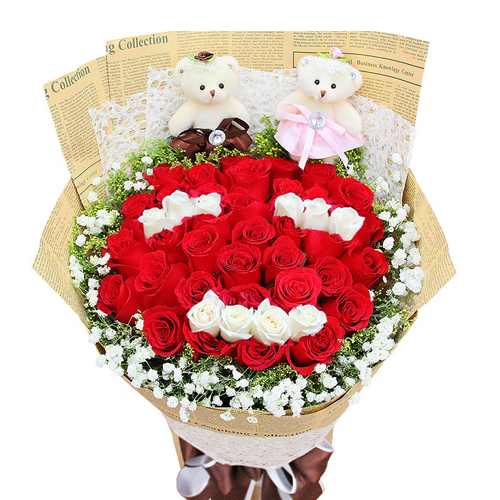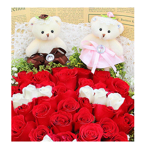 包装: 一对可爱小熊坐立花上,英文报纸,白色纱网,丝带包装。
