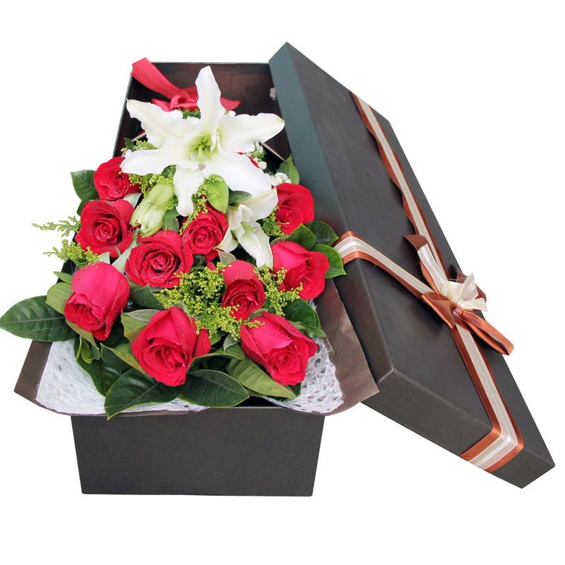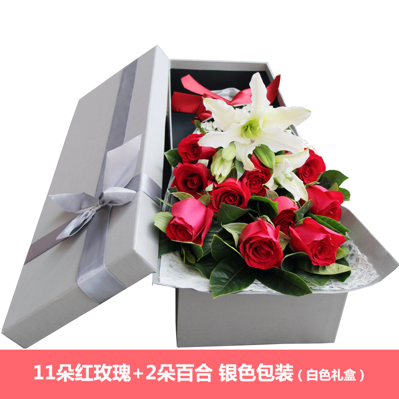 材质: 精选11朵红玫瑰,两枝多头百合 黄英栀子叶搭配