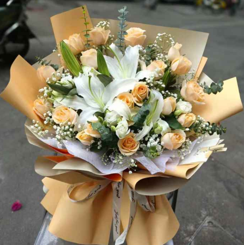 材质 21枝香槟玫瑰,5朵百合,白色洋桔梗,满天星,尤加利叶搭配