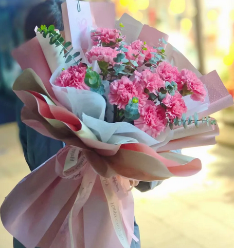 材质: 11枝粉色康乃馨,尤加利叶丰满,按图制作
