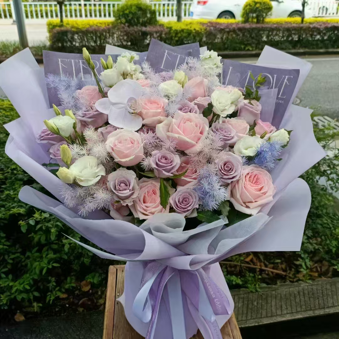 材质: 9朵粉玫瑰,12朵紫玫瑰,1枝蝴蝶兰,2枝白色紫罗兰,桔梗,蓬莱松如图喷色