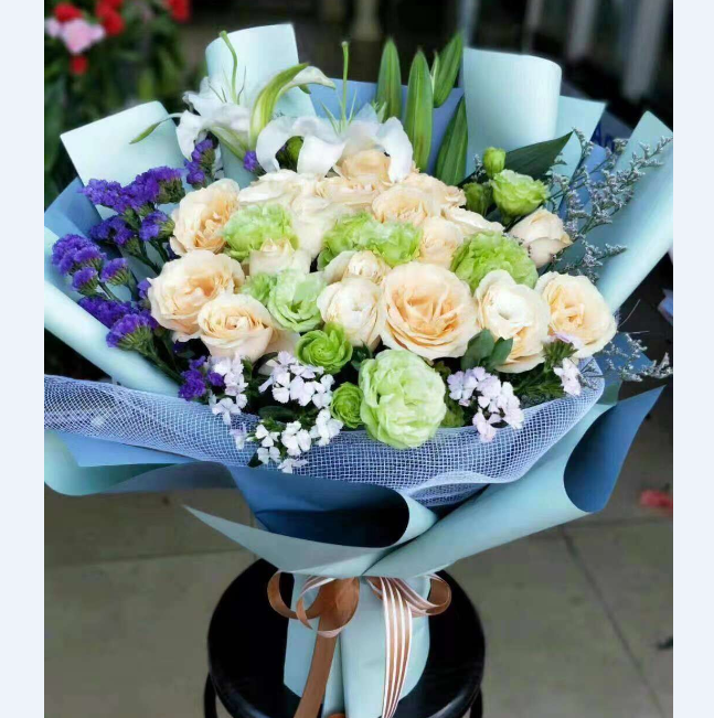 材质: 精选21枝香槟玫瑰 6朵百合 桔梗 勿忘我 情人草 相思梅搭配