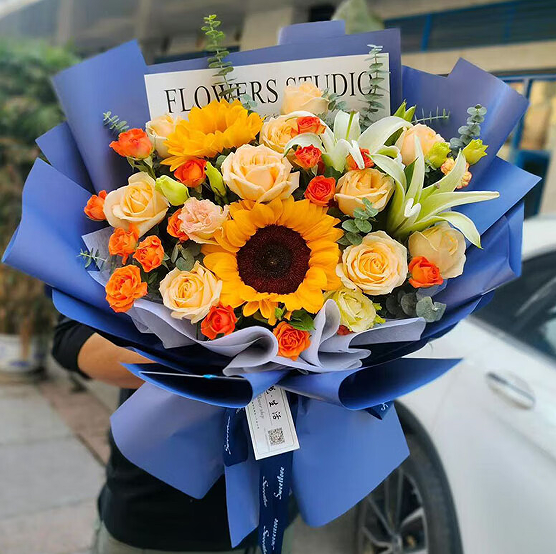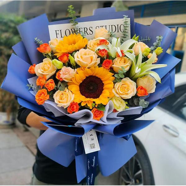 材质: 精选2朵向日葵 11朵香槟玫瑰 1枝多头百合,