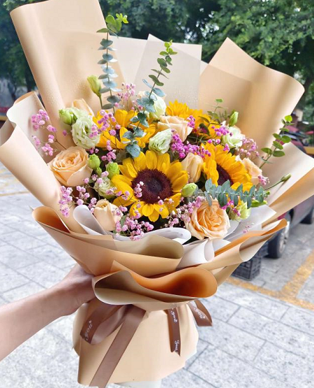 材质: 9枝香槟玫瑰,4枝向日葵,粉色满天星,洋桔梗,尤加利叶丰满搭配
