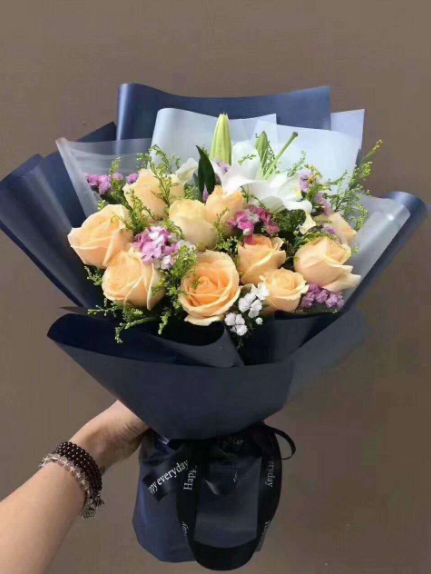 材质: 11枝香槟玫瑰,4朵百合,相思梅、黄莺间插点缀
