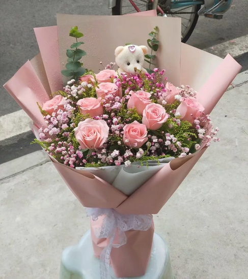 材质: 11枝戴安娜玫瑰,1只小熊,粉色满天星、黄莺、尤加利叶点缀搭配