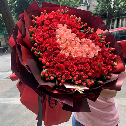 材质: 99枝红玫瑰和粉玫瑰混搭,做出心形造型,红豆搭配