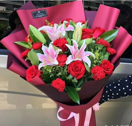 材质: 10朵红色康乃馨,9朵红玫瑰,6朵粉百合,绿叶黄英搭配