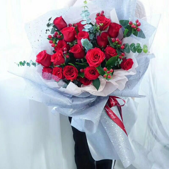 材质: 21枝红玫瑰,尤加利叶、相思红豆搭配