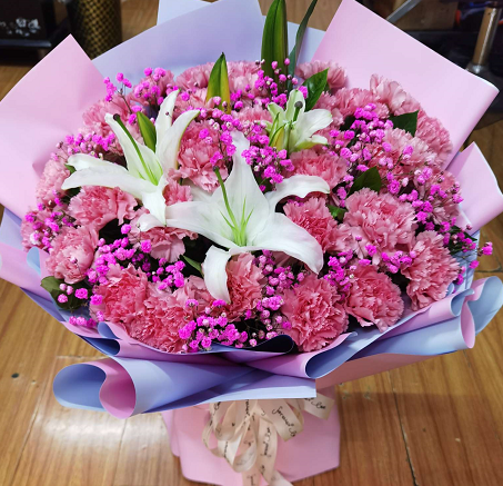 33枝粉色康乃馨,5朵百合,粉色满天星搭配