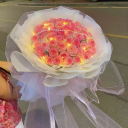 (彩灯)33枝粉玫瑰,1串珍珠,白纱包装