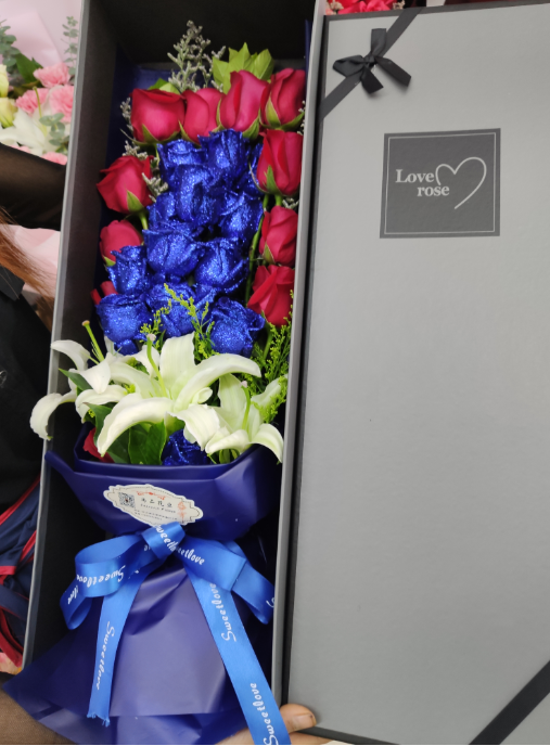 14枝蓝色妖姬,11枝红玫瑰,4朵白百合,黄英情人草点缀