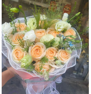 12枝香槟玫瑰,桔梗,绿铃草,蓝星花,
