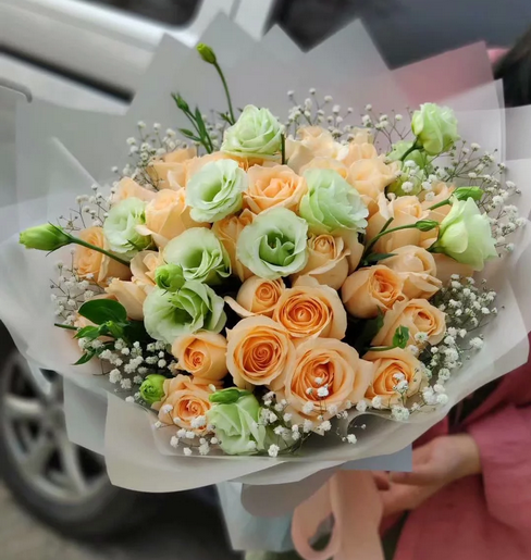 33朵香槟玫瑰,洋桔梗,满天星点缀