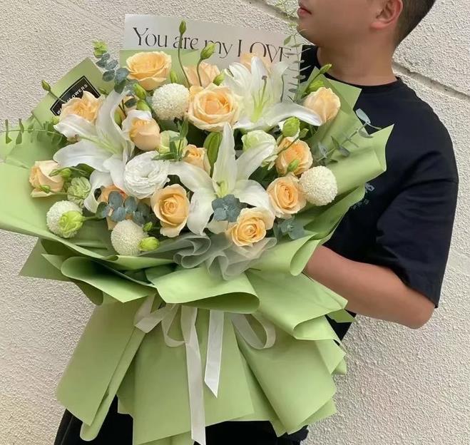 19枝香槟玫瑰,4支乒乓菊,5朵百合,白色和绿色洋桔梗搭配,尤加利叶点缀