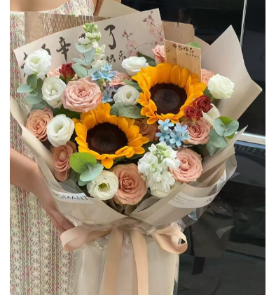 精选11枝卡布奇诺玫瑰,2枝向日葵,2枝白色紫罗兰,