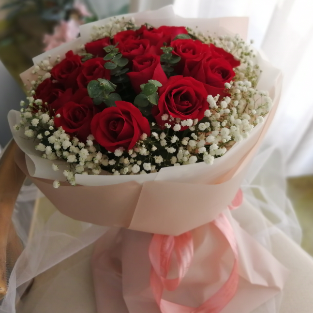 11朵红玫瑰 尤加利叶,满天星搭配