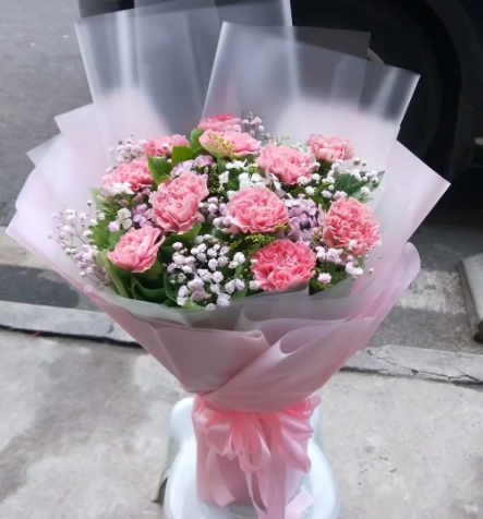 精选11枝粉色康乃馨,满天星 相思梅 黄英搭配