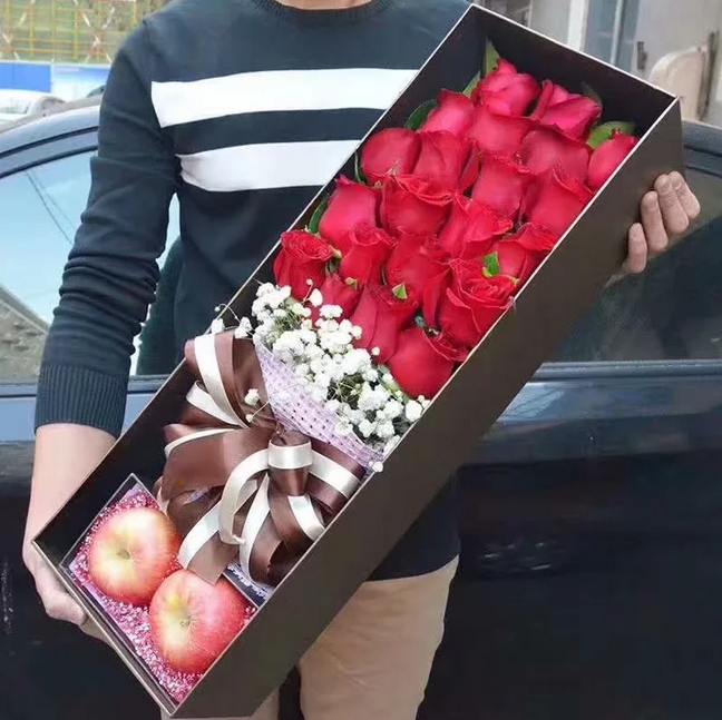 精选19枝红玫瑰,白色满天星搭配,2颗平安果