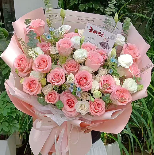 21枝戴安娜玫瑰,桔梗丰满,尤加利叶,绿铃草,蓝星花,喷泉草搭配