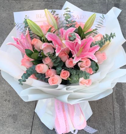 21枝粉玫瑰,3枝多头百合,尤加利叶丰满