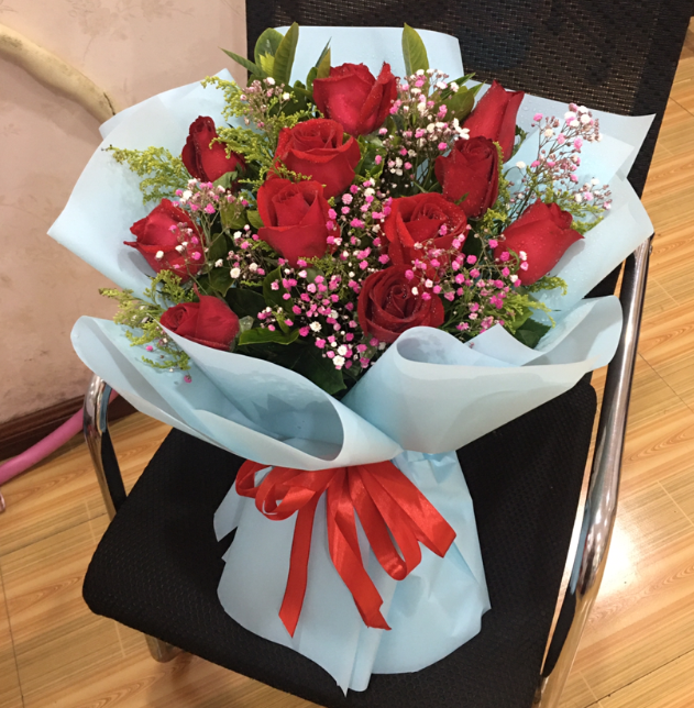 11枝红玫瑰,黄莺,满天星,绿叶搭配