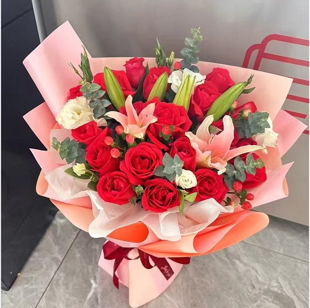 19枝红玫瑰,2枝多头粉百合,桔梗,尤加利叶,红豆搭配
