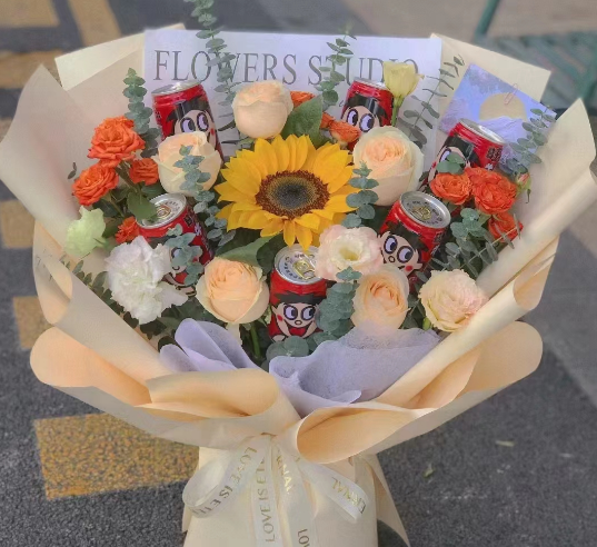 6罐旺仔牛奶(245ml/罐),香槟玫瑰,洋桔梗,橙色泡泡,尤加利叶搭配