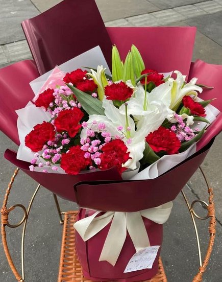 精选11枝红色康乃馨,2枝多头百合,粉色满天星,绿叶点缀