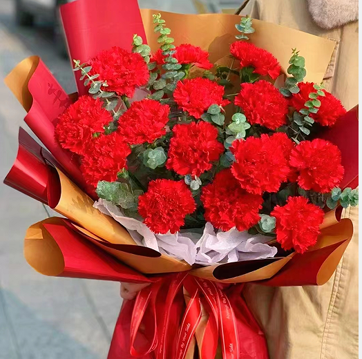 19枝红色康乃馨,尤加利叶搭配