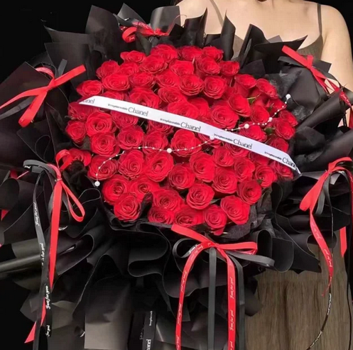 66枝红玫瑰,6个蝴蝶结丝带,1根珍珠串链,1条字母丝带搭配