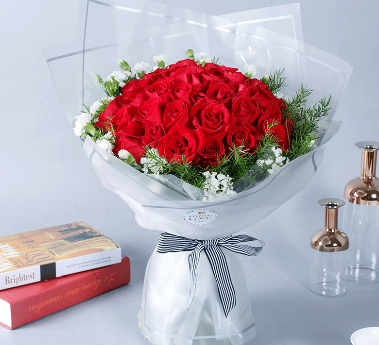 精选33朵昆明粉玫瑰,点缀满天星、绿叶,美丽迷人