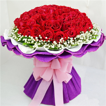 66枝优质红/粉玫瑰,满天星、栀子叶围边。
