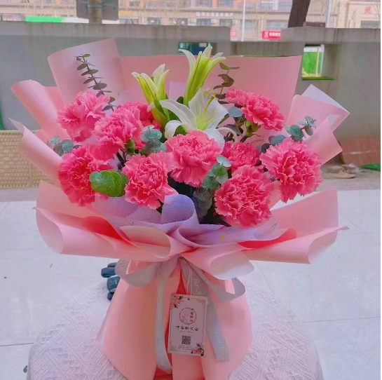 精选11枝粉色康乃馨 3朵粉色百合 尤加利叶搭配