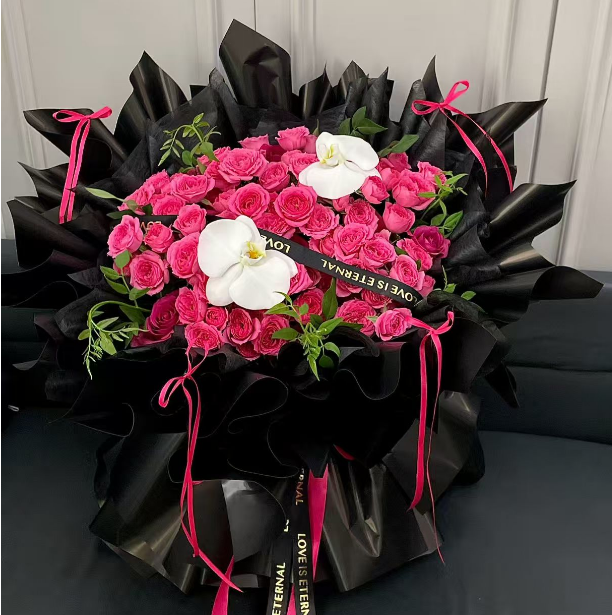 66枝弗洛伊德玫瑰,2枝蝴蝶兰,紫色+黑色丝带