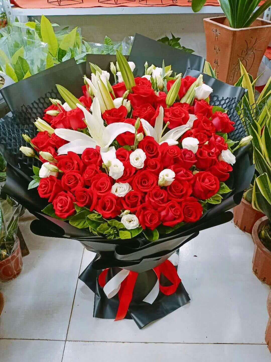 66枝红玫瑰,8朵白色百合,桔梗,绿叶插间