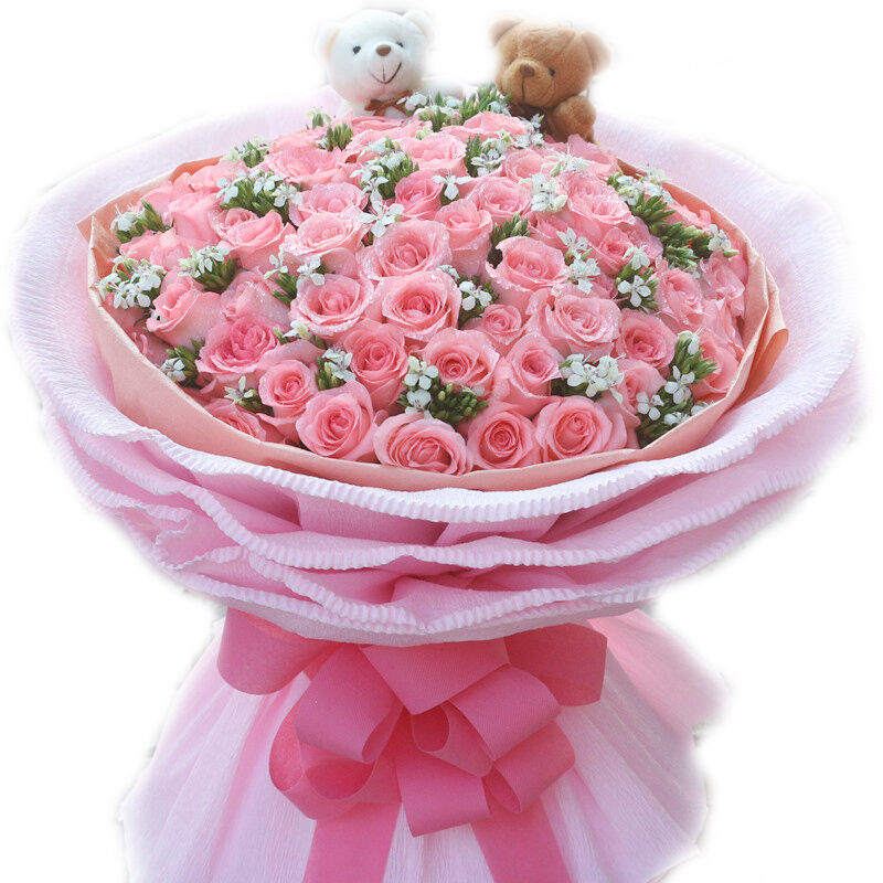57枝粉玫瑰,两只小熊,满天星点缀