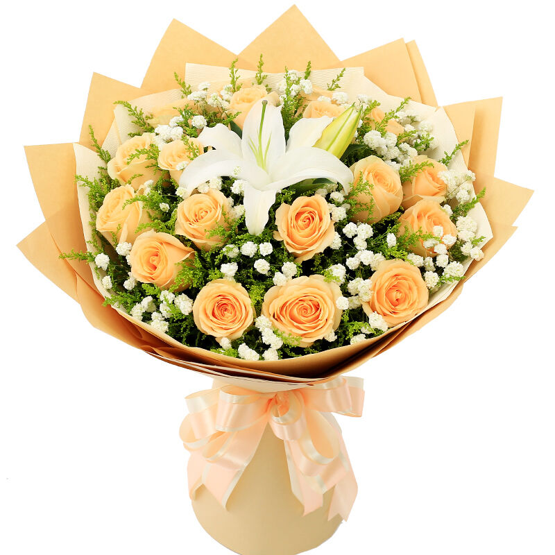 精选19朵香槟玫瑰+1枝香水百合,黄莺、满天星点缀,
