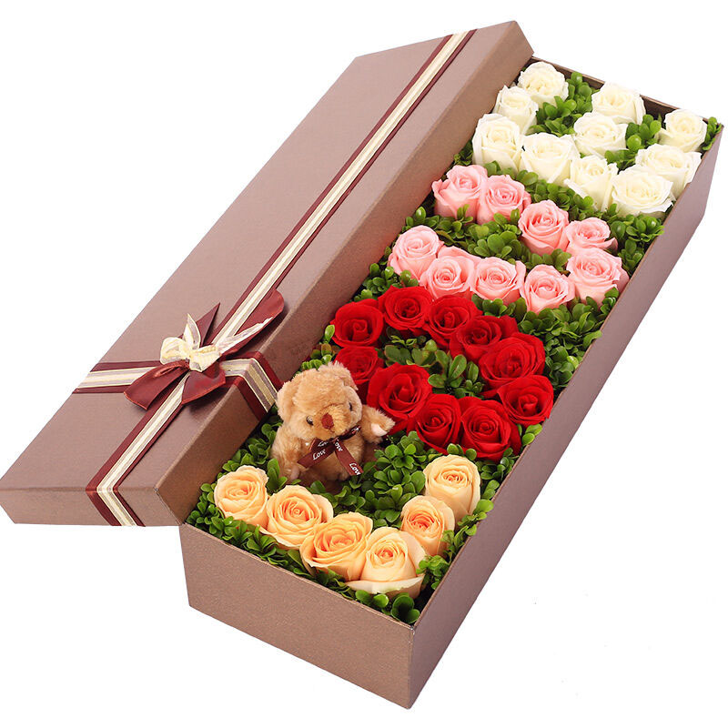 33枝混搭玫瑰,栀子叶铺底,小熊相伴